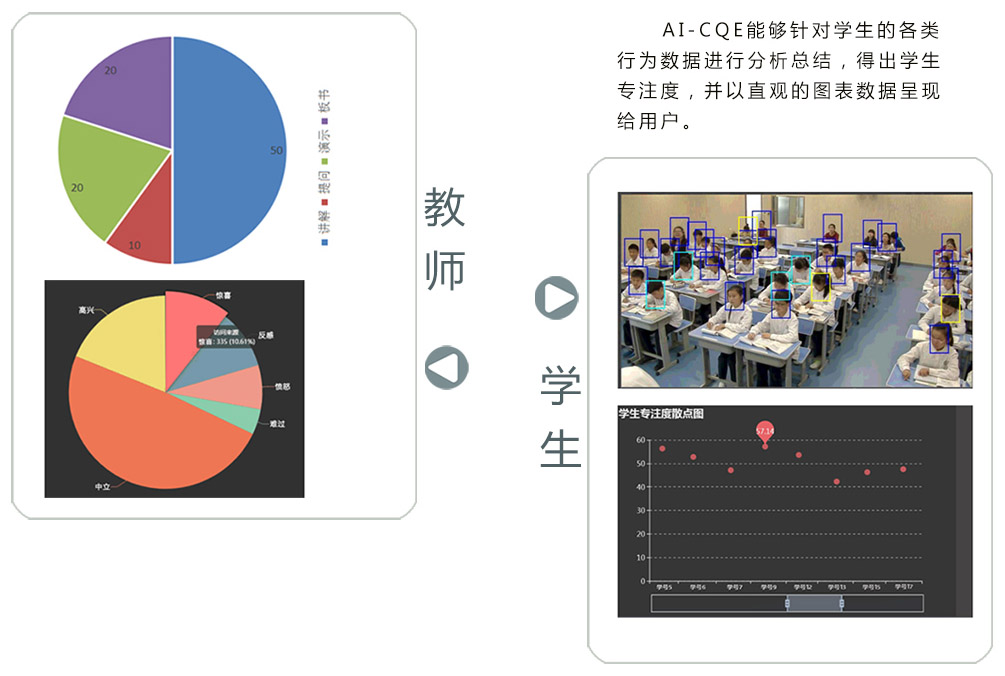 AI-CQE 根據數萬例課堂數據,采用深度學習的人工智能訓練方法,對實時錄播的課堂視頻及其他上傳的課堂視頻,進行人臉、表情及教師和學生的課堂行為的智能識別、記錄,再經過大數據計算分析處理后,將結果以更加直觀、更加友好的圖、表形式呈現給不同的教育工作者和關注者。