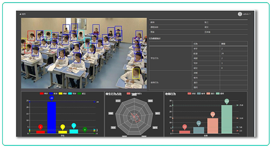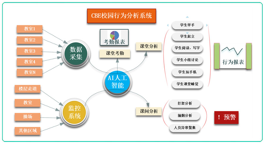 智慧校園行為分析系統CBE,是上海創視通軟件技術有限公司自主研發的基于人工智能+大數據分析的無感式考勤和行為分析系統。根據數萬堂真實課堂視頻數據以及校園監控視頻數據,采用深度學習的人工智能訓練方法,對學生課堂行為、課間行為進行智能識別,并生成相應的圖表報告,同時支持對學生進行課堂考勤以及課間違規行為預警。